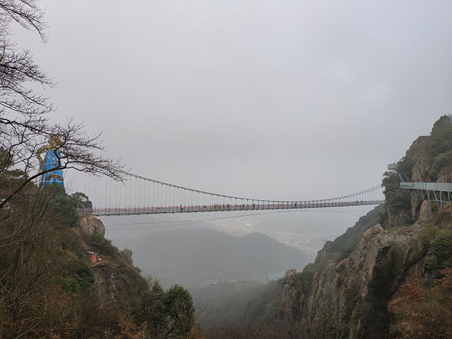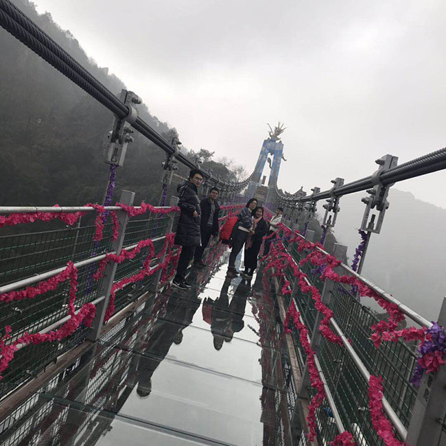 “飛龍玻璃橋”全長(zhǎng)388米,垂直高度180米,橫跨馬仁奇峰太陽(yáng)山與主峰之間,連接天梯玻璃棧道共同組成了一個(gè)高空體驗(yàn)觀景勝地。從遠(yuǎn)處看,兩條巨龍盤(pán)踞在玻璃橋兩端,橋下萬(wàn)株楠木,宛如一幅“飛龍?zhí)鞓蚩撮!钡慕^妙畫(huà)卷。